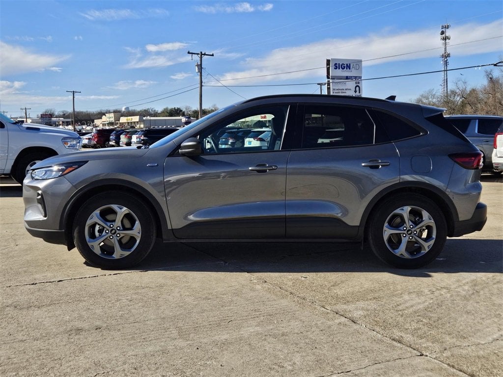 Escape ST-Line, 4D Sport Utility, 1.5L EcoBoost, 8-Speed Automatic, FWD, Gray Metallic, Ebony.Gray Metallic 2025 Ford Escape ST-Line 1.5L EcoBoost 8-Speed Automatic FWDEscape ST-Line, 4D Sport Utility, 1.5L EcoBoost, 8-Speed Automatic, FWD, Gray Metallic, Ebony, 3.81 Axle Ratio, 4-Wheel Disc Brakes, 6 Speakers, ABS brakes, Air Conditioning, Alloy wheels, AM/FM radio: SiriusXM, AM/FM Stereo, Auto High-beam Headlights, Automatic temperature control, Brake assist, Bumpers: body-color, Compass, Delay-off headlights, Driver door bin, Driver vanity mirror, Dual front impact airbags, Dual front side impact airbags, Electronic Stability Control, Emergency communication system: SYNC 4 911 Assist, FordPass Connect, Four wheel independent suspension, Front anti-roll bar, Front Bucket Seats, Front Center Armrest, Front dual zone A/C, Front reading lights, Fully automatic headlights, Illuminated entry, Internet access capable: FordPass Connect 4G, Knee airbag, Low tire pressure warning, Occupant sensing airbag, Outside temperature display, Overhead airbag, Overhead console, Panic alarm, Passenger door bin, Passenger vanity mirror, Power door mirrors, Power driver seat, Power steering, Power windows, Radio data system, Rear anti-roll bar, Rear reading lights, Rear seat center armrest, Rear window defroster, Rear window wiper, Remote keyless entry, Speed control, Speed-sensing steering, Speed-Sensitive Wipers, Split folding rear seat, Spoiler, Sport steering wheel, Steering wheel mounted audio controls, SYNC 4, Tachometer, Telescoping steering wheel, Tilt steering wheel, Traction control, Trip computer, Variably intermittent wipers, Vinyl/Cloth Front Sport Contour Bucket Seats, and Wheels: 18 Rock Metallic Painted Aluminum.